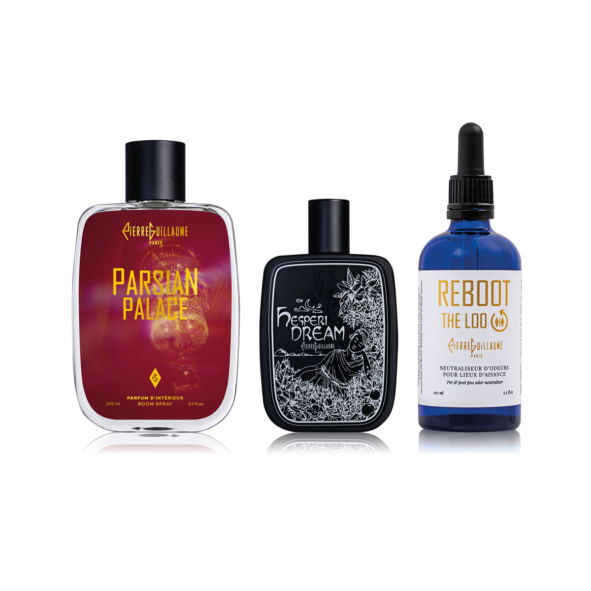 Pour cette seconde Parure d’Ambiance, Pierre Guillaume Paris propose une sélection de produits signatures de la maison tels que Reboot the Loo et Hesperidream, accompagné d’un parfum d’intérieur exclusif : Parisian Palace. Essences de bois précieux, chaleur des moquettes épaisses et des velours chatoyant, volutes de bougies parfumées raffinées, impressionnant bouquets de fleurs… Parisian Palace condense dans son sillage toute la préciosité de ces temples de l’hôtellerie de luxe.